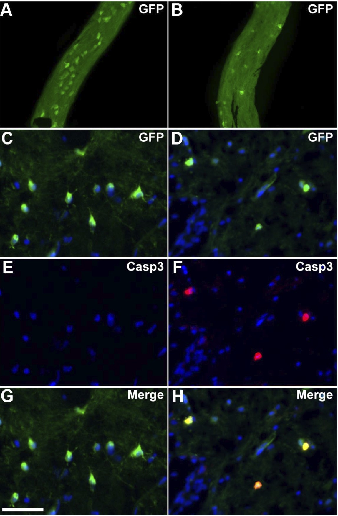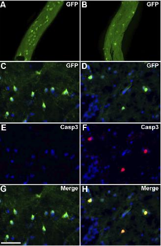 Figure 3. Oligodendrocyte depletion and apoptosis in transgenic tadpoles following MTZ treatment. A,B, Whole-mount two-photon microscopy of the optic nerve at stage 55 showing GFP+cells in transgenic animals untreated (A) or MTZ-treated for 3 d (B). MTZ induced a severe depletion of GFP+ cells in the optic nerve. C–H, Immunolabeling for GFP and activated caspase3 (Casp3) on coronal sections across the medulla in untreated (C, E, G) or MTZ-treated (D, F, H ) transgenic animals. In MTZ-treated animals, activated caspase3 is detected in GFP + cells. Scale bar (in G) A, B, 150um; C–H, 50 um.