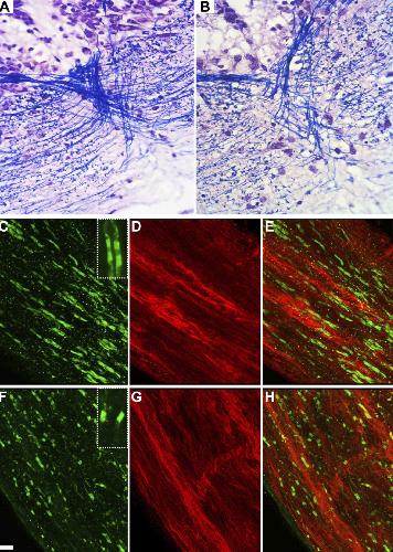 Figure 4. MTZ treatment induces demyelination without axonal damage. A, B, Myelinated fibers staining with Luxol fast blue on coronal sections across the medulla at stage 55 in untreated (A) or MTZ-treated (B) transgenic animals. C–H, Whole mount of optic nerve at stage 55 immunostained for neurofascin (green) and SMI-31 (red) in untreated (C–E) or MTZ-treated (F–H ) transgenic animals. Insets in C and F are high magnifications of nodes of Ranvier showing a strong signal for NF 155 in the paranodal domain and a weaker signal in the node (NF186) in a control animal (C), where in case of partial demyelination, only hemiparanodes are labeled (F ). MTZ treatment induced demyelination, characterized by disorganization of the neurofascin nodes of Ranvier (F, H ) with numerous heminodes compared with control (C, E). In MTZ-treated tadpoles, SMI-31 axons had a normal appearance (G, compared with D), suggesting that MTZ-induced demyelination does not affect the axons. Scale bar (in F ) A,B,17 um; C–H, 5um;insets (C,F), 2um.