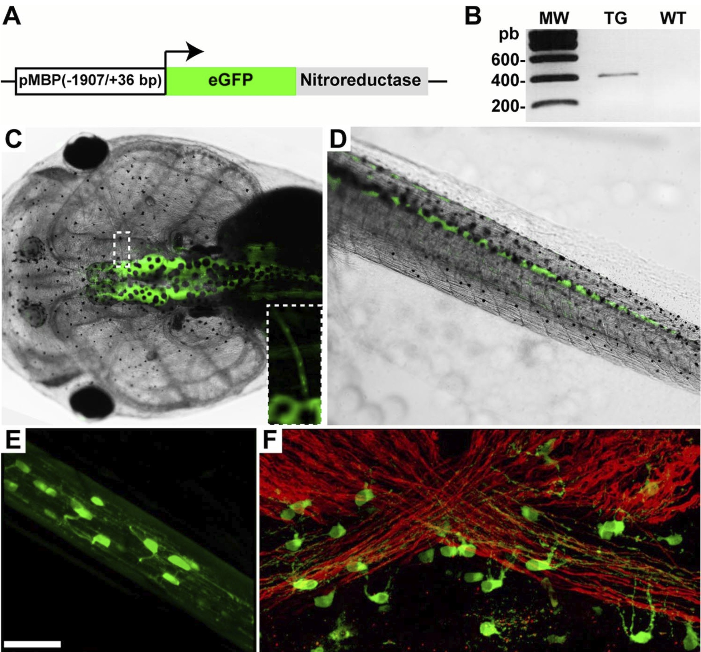 Figure 1. Structure and expression of the pMBP-eGFP-NTR transgene. A, Schematic diagram of the pMBP-eGFP-NTR construct. The transgene contains the eGFP open reading frame fused to that of E. coli NTR placed under the control of the DNA regulatory sequence of the murine MBP gene (-1907 bp and +36 bp). B, RT-PCR performed on RNA extracted from brains of transgenic (TG) or wild-type (WT) tadpoles used to amplify a 394 bp fragment corresponding to the junction of eGFP/NTR sequence. CâF, Transgene expression as assessed by GFP fluorescence (CâE) or immunolabeling (F ) in a pMBP-eGFP-NTR transgenic tadpole at stage 55. Dorsal view of the head (C) and sagittal view of the tail (D). Expression is only observed in the CNS (brain and spinal cord) but not in the peripheral nervous system. Inset in C is a higher magnification to illustrate the detection of GFP in the optic nerve. E, In vivo stack of images of the optic nerve obtained by two-photon microscopy. Note the fluorescent processes of the GFP + cells. F, Confocal image of a whole mount of the optic chiasm immunostained for MBP (red) and GFP (green). Note the GFP + cell bodies extending their processes toward the strongly MBP +myelinated fibers. Scale bar (in E) C, D, 2 mm; E, F, 50 um; inset (C), 1 mm.