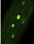 Movie 1 (still from). Faint detection of GFP in myelin along optic nerve axons of stage 50 pMBP-eGFP- NTR transgenic tadpole. At this early developmental stage, the wrapping process is ongoing, therefore myelin is still not completely compact and this allows diffusion of GFP in the myelin cytoplasmic compartment. This movie represents the Z-projection of 17 successive optical sec- tions across the thickness of the optic nerve imaged by two-photon microscopy.