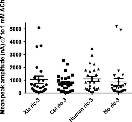 RIC-3 enhances the functional expression of certain nicotinic acetylcholine receptors (nAChRs) in vertebrates and invertebrates and increases the availability of functional receptors in cultured cells and Xenopus laevis oocytes. Maximal activity of RIC-3 may be cell-type dependent, so neither mammalian nor invertebrate proteins is optimal in amphibian oocytes. We cloned the X. laevis ric-3 cDNA and tested the frog protein in oocyte expression studies. X. laevis RIC-3 shares 52% amino acid identity with human RIC-3 and only 17% with that of Caenorhabditis elegans. We used the C. elegans nicotinic receptor, ACR-16, to compare the ability of RIC-3 from three species to enhance receptor expression. In the absence of RIC-3, the proportion of oocytes expressing detectable nAChRs was greatly reduced. Varying the ratio of acr-16 to X. laevis ric-3 cRNAs injected into oocytes had little impact on the total cell current. When X. laevis, human or C. elegans ric-3 cRNAs were co-injected with acr-16 cRNA (1 : 1 ratio), 100 μM acetylcholine induced larger currents in oocytes expressing X. laevis RIC-3 compared with its orthologues. This provides further evidence for a species-specific component of RIC-3 activity, and suggests that X. laevis RIC-3 is useful for enhancing the expression of invertebrate nAChRs in X. laevis oocytes.