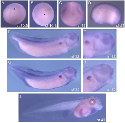 Whole mount in situ hybridization using an anti-sense probe. (A) Stage 10.5, vegetal view, dorsal up; (B) stage 10.5, lateral view, asterisk marks the dorsal lip of blastopore; (C) anterior view, dorsal up; (D) stage 21; (E) stage 32; (F) stage 32, zoom of head region; (G) stage 35; (H) stage 35, zoom of the head; (I) stage 41 tadpole. All views of (DâI) are lateral, anterior to the right. |