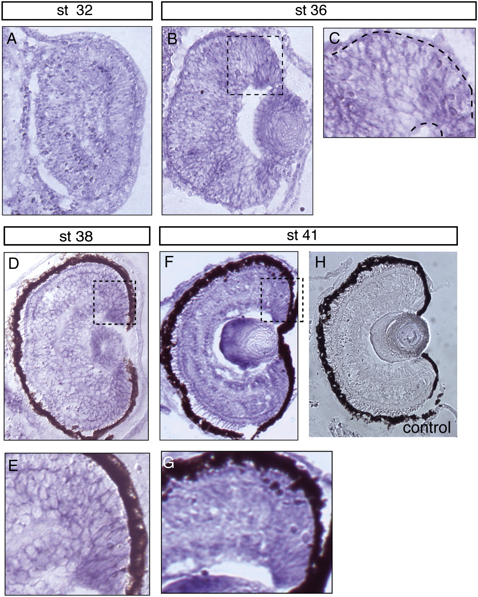 (A) Stage 32; (B) stage 36 and magnification of highlighted area in (C); (D) stage 38 and higher magnification view at (E); (F) stage 41 and highlighted magnification in (G). (H) Control section using sense probe at stage 41. The CMZ area of the retina is highlighted by black dotted squares in (B), (D) and (F) and shown in magnified views in (C), (E) and (G) respectively. |