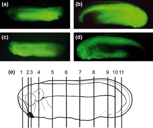 Fig. 3. The completely patterned tailbud larvae and analyzed levels by transverse sectioning. (a�d) External views of a com- pletely patterned (dorsoanterior index (DAI) 5, Kao & Elinson 1988) identical RH-RD tailbud larva (a, c; stage 27) and an identi- cal W-RD larva (b, d; stage 26). Note that the fluorescence derives from not only the epidermis but also the inner tissues, due to the thinness of the epidermis at this stage. The magnifica- tion in a�d is the same, and the samples are viewed from the right side (a, b) and left side (c, d). (e) Levels of transverse sec- tions analyzed along the anteroposterior axis. The numbered sec- tions cut through the following tissues or locations: 1, telencephalon; 2, diencephalon, pharyngeal endoderm anterior to the first visceral pouch; 3, retina, cement gland, mesencephalon, first visceral pouch; 4, ear vesicle, rhombencephalon, heart; 5, pronephric anlage, liver; 6, 7, 8, the intervals between sections 5 and 9 are all the same; 9, anus; 10, the position halfway between Nos. 9 and 11; 11, chordoneural hinge. The abbrevia- tions for the larvae are the same as in Figures 1 and 2. |