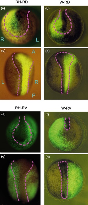 Fig. 2. Representative distributions of the labeled blastomere progeny in the ectoderm of regulated right half (RH) and normal embryos at the late gastrula or early neurula stage. (a, c) A right dorsal blastomere-labeled regulated embryo (RH-RD) at stage (St.) 13. (b, d) A right dorsal blastomere-labeled whole (normal) embryo (W-RD) at St. 15. (e, g) A right ventral blastomere-labeled regulated embryo (RH-RV) at St. 15 and 14. (f, h) A right ventral blastomere-labeled whole embryo (W-RV) at St. 18 and 17. The dashed lines indicate the margin of the neural plate or the top of the neural fold. Embryos are viewed from the anterior (a, b, e, f) and dorsal (c, d, g, h) sides. A, anterior; L, left; P, posterior; R, right. |
