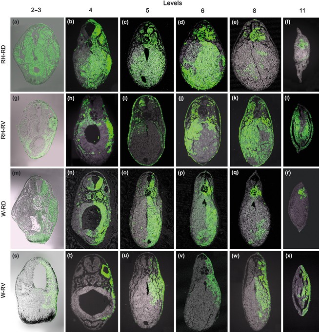 Fig. 4. Section images showing representative distributions of the labeled blastomere progeny in regulated and normal tailbud larvae. (a�f) RH-RD. (g�l) RH-RV. (m�r) W-RD. (s�x) W-RV. The numbers on the uppermost line indicate the analyzed section levels (Fig. 3). The right and the left sides in the panels coincide with those in the embryos, with the dorsal being the top and the ventral the bottom. The abbreviations for the larvae are the same as in Figures 1 and 2. |