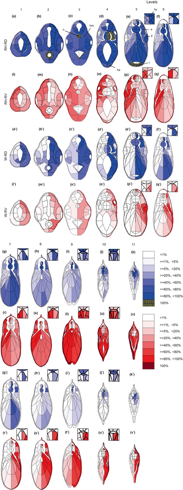 Fig. 5. Averaged distribution maps of the blastomere clones in regulated and normal tailbud larvae. The gradation in blue or red indi- cates the population percentage of the RD or RV clone (the right upper corner of the figure). The numbers on the upper line indicate the analyzed section levels (Fig. 3). The rectangles in the upper right corner of the panels, at levels 5�10, show the magnified tissues around the hypochord. The abbreviations at the left end of the panel lines and the orientations of the embryos in the panels are the same as in Figures 1, 2, and 4, respectively. ha, heart anlage; hm, head mesenchyme; hy, hypochord; l, liver; n, notochord; p, pronephric anlage; s, somite. |