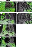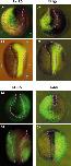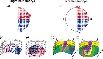 Fig. 7. The putative prospective midlines and distribution of the right blastomere clones on the gastrocoel roof in RH embryos and normal embryos. The densities of the blue and red dots represent the cell-percentages of the RD and RV clones. The left and right half of the panels in the two panel lines show an RH embryo (a) or a regulated RH embryo (c, d), and normal embryos (b, e, f), respectively. (a, b) Animal views of the four-cell stage embryos. The prospective dorsal and ventral midlines are represented with the blue and red arrowheads. (c�f) The gastrocoel roof at stage 15, cut transversely into anterior (c, e) and posterior (d, f) parts. Prospective tissues in the fate maps (Shook et al. 2004; permission from Elsevier) were colored only in normal embryo (e, f): the gastrocoel roof plate (GRP) con- sists of the prospective regions for the ventral part of the notochord (magenta), the hypochord (gray), and the medial ventral cells of the somites (yellow). The lateral endodermal crests (LECs) (yellow green) that derived from the supra-blastoporal endoderm and the endo- derm that originated from the sub-blastoporal region (green) serially flank the GRP. At later stage, the prospective hypochord segments fuse in the ventral position to the notochord (Fig. 5, rectangles), and LECs form the most dorsal regions in the yolky endoderm on both sides. A, anterior; D, dorsal; L, left; P, posterior; R, right; V, ventral. |