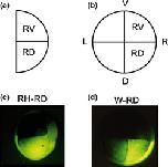 Fig. 1. Nomenclature of the blastomeres and embryos receiving a tracer injection. (a, b) Graphical representation of the animal pole view of a right half (RH) embryo (a) and a normal embryo (b) at the four-cell stage, and the nomenclature of the right blastomeres. (c, d) Animal pole views of a right dorsal blasto- mere-labeled RH embryo (c; RH-RD) and a right dorsal blasto- mere-labeled whole (normal) embryo (d; W-RD) at the eight-cell stage. The orientations are the same in all of the embryos. D, dorsal; L, left; R, right; RD, right dorsal blastomere; RV, right ventral blastomere; V, ventral. |