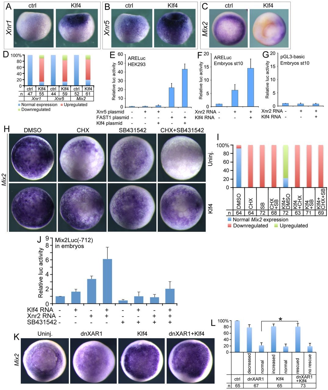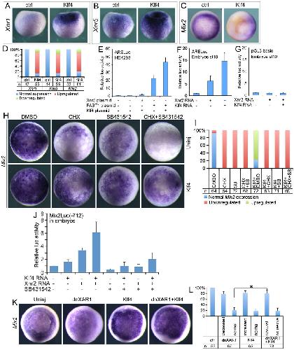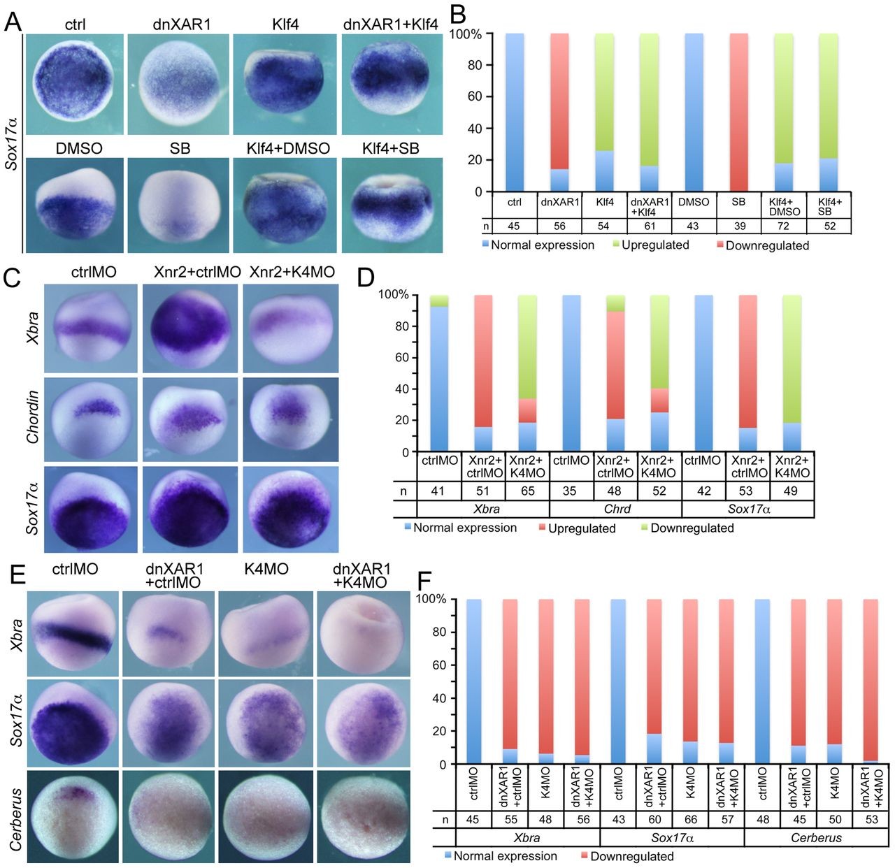 Fig. 7. Combinatorial effects of Nodal/Activin and Klf4 on germ-layer differentiation. (A) The effect of blocking Nodal/Activin via injection of dnXAR1 or treatment with SB431542 (SB) on Klf4-induced endoderm gene expression. The âctrlâ and âdnXAR1â embryos were orientated in vegetal view; the others were in lateral view to show staining in both vegetal and animal regions. (B) Quantification of embryos with normal or altered Sox17α expression in A in triplicate. (C) The effect of K4MO or/and Xnr2 mRNA injection on mesoderm and endoderm gene expression. The embryos are in lateral view. (D) Quantification of embryos with normal or altered gene expression in C in triplicate. (E) The effect of injection of dnXAR1 or/and K4MO on mesendoderm gene expression. The embryos for âXbraâ staining are in lateral view, whereas the rest are in vegetal view. (F) Quantification of embryos with normal or altered gene expression in E in three experiments. In all experiments above, 1.5 ng dnXAR1 mRNA, 300 pg Klf4 mRNA, 15 ng ctrlMO or K4MO, 2 pg Xnr2 mRNA were injected. Injected or treated embryos were collected at stage 10.5 for whole-mount in situ hybridization. |