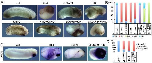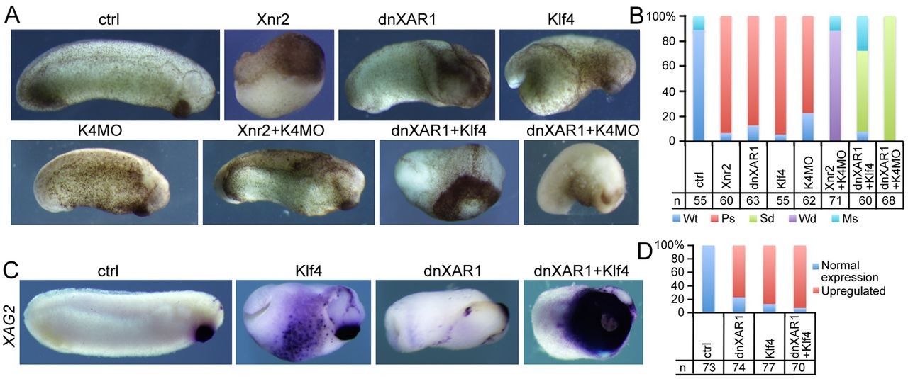 Fig. 6. Correlation between Nodal and Klf4 during embryonic development. (A) Injection of Xnr2 mRNA, dnXAR1 mRNA, Klf4 mRNA, or K4MO individually or in different combinations, as labeled above each panel, generated different effects on embryogenesis. (B) Quantification of phenotypes observed in A in three experiments. Wt, wild type; Ps, phenotypic changes after single injection; Sd, stronger phenotype after double injection; Wd, weaker phenotype after double injection; Ms, other phenotypes, such as those dead, or similar to phenotypes after single injection. (C) Expression of XAG2 in uninjected control embryos at stage 28 and injected embryos as indicated. (D) Quantification of XAG2 expression in embryos in C in four experiments. In all experiments above, 1.5 pg Xnr2 mRNA, 1.5 ng dnXAR1 mRNA, 300 pg Klf4 mRNA or 5 ng K4MO was injected. Injections of Xnr2 alone or Xnr2 plus K4MO together were radial, while others were ventral injections made at the four-cell stage. |