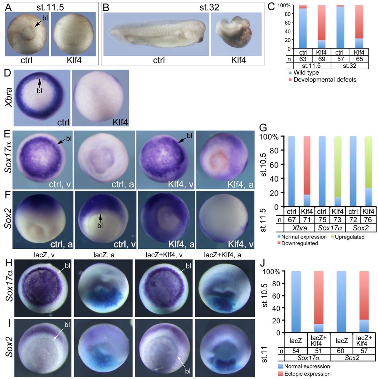 Fig. 1. Overexpression of Klf4 in Xenopus early embryos. (A,B) The effect of Klf4 mRNA injection on gastrulation (A) and on body axis formation (B). (C) Quantification of phenotypes shown in A and B in triplicate. (D-F) The influence of Klf4 mRNA injection on mesoderm (D), endoderm (E) and ectoderm (F). Embryos in D were placed in vegetal views; those in E and F were placed in vegetal view (v) and animal view (a), separately. (G) Quantification of embryos with gene expression observed in D,E,F. In these experiments, 400 pg of Klf4 mRNA were injected into the equatorial region of all blastomeres of two-cell or four-cell embryos. (H,I) lacZ labeling of targeted injection into one animal-ventral blastomere at the eight-cell stage and whole-mount in situ hybridization detection of Sox17-alpha (H) and Sox2 (I) expression. Embryos were also placed in animal (a) and vegetal (v) views, respectively, as indicated at the top of the panels. (J) Quantification of embryos with normal or ectopic gene expression in H and I. lacZ mRNA was injected at 20 pg/nl; Klf4 mRNA was injected at 40 pg/nl. The arrows indicate the blastopore (bl). In all the panels, dorsal is up for Sox2-stained embryos. |
