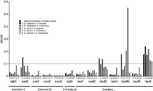 Figure 5. Ratios of nonsynonymous/synonymous (dN/dS) nucleotide substitutions between the protein-coding genes of xenopus mitochondrial genomes. Although the ratios differ considerably between genes, complexes and pairs of species, in all cases genes are evolving under negative (purifying) selective pressure (dN/dS < 1).