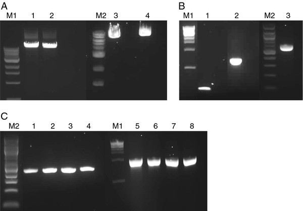 Figure 1. Long PCR, COX1, 16S, primer region 1 and primer region 2 amplicons. Agarose gel electrophoresis of (A) Xenopus borealis (XB; lanes 1 and 2) and X. victorianus (XV; lanes 3 and 4) PCR fragments using Long F1/R2 (lanes 1 and 3) and Long F2/R1 primers (lanes 2 and 4). (B) XB (lanes 1 and 2) and XV (lane 3) PCR fragments using COX1 (lane 1) and 16SA-Lmod/H (lanes 2 and 3) primers. (C) XB (lanes 1-2 and 5-6) and XV (lanes 3-4 and 7-8) PCR fragments using AMP1F/R (lanes 1-4) and AMP2F/R (lanes 5-8) primers. M1 and M2â=â1kb and 100bp DNA ladders, respectively.