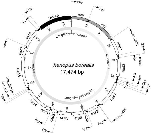 Figure 2. Xenopus borealis mitochondrial genome. The complete mitochondrial genome of Xenopus borealis (17,474 bp, drawn to scale) All 13 protein coding genes are shown as open arrows, 2 ribosomal RNAs as shaded arrows and 22 tRNAs as arrowed lines. Each tRNA is shown by its single letter amino acid code. The two leucine and two serine tRNAs are differentiated by their respective anti-codons. The direction of transcription is indicated by the arrows. Also shown is the non-coding D-loop (control region, black) and the position of the primers (LongF1/R2 and LongF2/R1) used to generate the two long-PCR amplicons, which were pooled and sequenced using 454 technology.