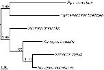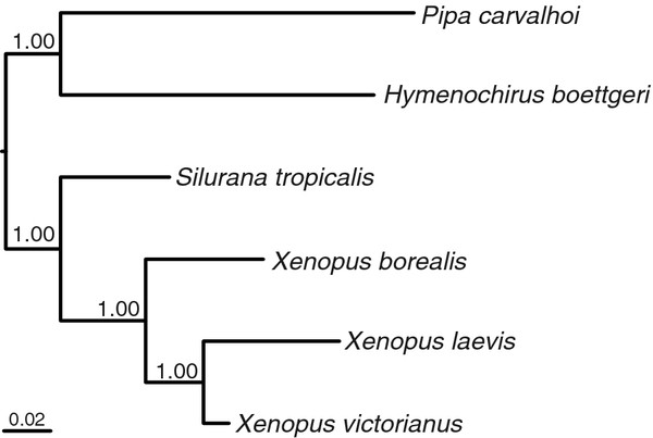 Figure 3. Phylogenetic estimates of the interrelationship of four xenopus species and two relatives based on Bayesian analysis of amino acids from concatenated protein coding sequences. Nodal support is given by posterior probabilities; branch-length scale indicates number of substitutions per site.