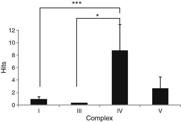 Figure 6. Summary of expressed sequence tag database analyses of S. tropicalis protein coding sequences. Mean (±s.e.m.) number of ESTs in Xenbase with ≥ 90% similarity to each of the 13 mitochondrial protein-coding sequences from ST. Individual gene sequences have been combined and are presented for each complex of the respiratory chain. ∗ = P <0.05 and ∗∗∗ = P <0.003 between complexes (as indicated).