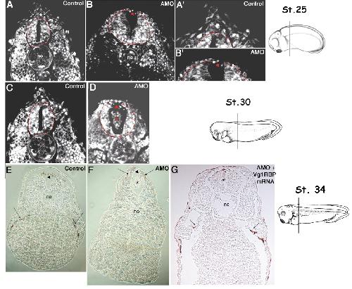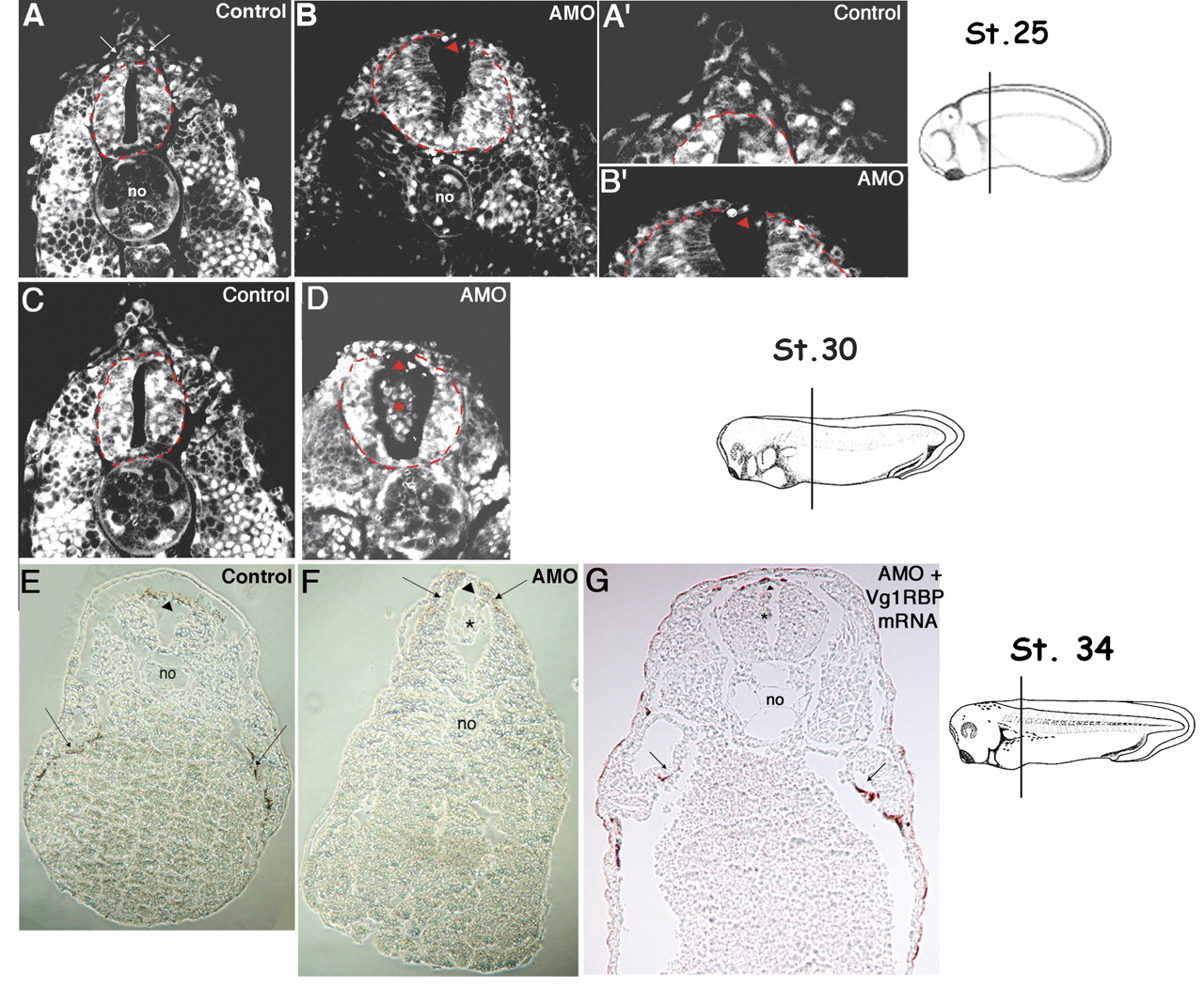 Figure 3. Antisense Vg1 RBP oligonucleotides disrupt roof plate formation and neural crest migration. Transverse confocal and paraffin sections were obtained from tailbud stage embryos injected with CMO (A,Aâ²,C,E), AMO (B,Bâ²,D,F), or AMO with sense Vg1 RBP mRNA (G). For each experiment, the approximate plane of section is indicated. Neural crest cells, indicated by the arrows, are found dorsal to the neural tube in CMO-injected embryos (A,Aâ²,C), but are not detectable in the corresponding AMO-injected embryos (B,Bâ²,D). Aâ² and Bâ² are high power magnifications of A and B, respectively. By stage 34, pigmented melanophores are observable both above the roof plate and at lateral-ventral positions in embryos injected with either CMO (E), or with AMO and sense Vg1 RBP mRNA (G). In AMO-injected embryos at this stage (F), however, the only detectable pigment is in the dorsal half of the neural tube and is completely absent from the lateral or ventral regions. The position of the neural tube roof plate is indicated by an arrowhead; note that it is missing in the AMO-injected embryos (B,Bâ²,D,F), and normally formed in the `rescued' embryos (G). Apparently apoptotic cells (*) are observed in the lumen of AMO-injected, tailbud stage embryos (D,F,G). In A-D, the neural tube is outlined in red. no, notochord. |
