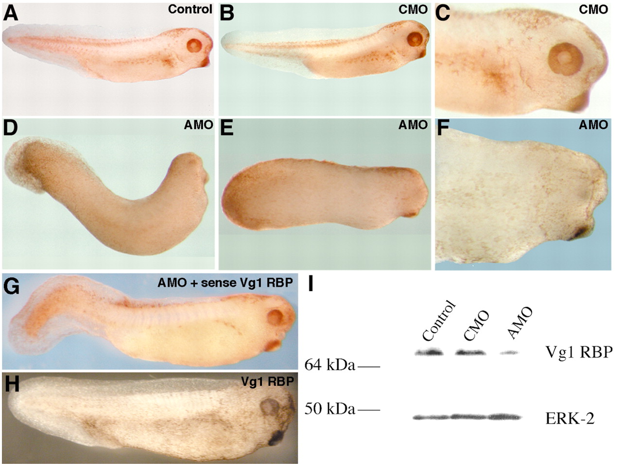 Figure 2. Specific effect of antisense Vg1 RBP oligonucleotide on Xenopus development. Two-cell stage embryos were injected in both blastomeres with equal amounts of CMO (B) or AMO (D,E) and allowed to develop to the tailbud stage. Embryos injected with CMO were identical to uninjected sibling embryos (A). Note the abnormal head development, lack of dorsal fin, curved neural tube, and severe reduction in normal pigmentation in embryos injected with AMO. (C,F) Close-up views of the head regions of B and E, respectively, show defective lens formation in the AMO-injected embryos (F). Note the presence, in these embryos, of a pigmented retinal epithelium below the undifferentiated, overlying ectoderm. (G) Sense Vg1 RBP mRNA can rescue AMO-injected embryos. Both blastomeres of two-cell stage embryos were co-injected with AMO and sense Vg1 RBP-GFP mRNA, lacking the 5â² UTR that contains the AMO target sequence. Embryos were allowed to develop until tailbud stage. Note the rescue of lens and dorsal fin formation and of melanophore migration. (H) Overexpression of Vg1 RBP-GFP mRNA alone does not affect the normal development of the embryo. (I) Vg1 RBP translation is reduced specifically by AMO injection. Proteins were extracted from tailbud-stage, uninjected (control) embryos, and from embryos injected with either CMO (CMO) or AMO (AMO). Two embryo-equivalents were loaded in each lane and Vg1 RBP expression was analyzed by electrophoresis and western blot analysis using an anti-Vg1 RBP antibody. As measured by densitometry, Vg1 RBP levels are reduced to 20% of original levels in the AMO-injected embryos relative to both uninjected and CMO-injected embryos; samples were normalized to the internal ERK-2 control (detected by anti-ERK-2 antibody). |