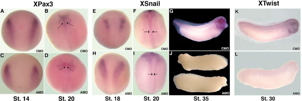 Fig. 4. Downregulation of Vg1 RBP does not affect roof plate and neural crest cell determination. Xpax3 mRNA expression was assayed by in situ hybridization, in embryos injected with either CMO (A,B) or AMO (C,D). Dorsal view of a CMO- (A) and AMO- (C) injected embryos at stage 14 showing expression of Xpax3 in the lateral domains of the neural plate. Following neural fold fusion, in CMO-injected embryos (B), roof-plate cells normally reach the midline and Xpax3 expression is observed in the dorsal aspect of the tube (arrows). In AMO-injected embryos (D), roof plate cells fail to migrate medially, and a groove devoid of Xpax3 expression is observed along the dorsal midline (arrows). Xsnail expression was also analyzed in CMO- (E-G) and AMO- (H-J) injected embryos. In stage 18 embryos, immediately preceding neural fold fusion, expression of Xsnail is not reduced, and in fact is somewhat enhanced, by AMO injection (H) when compared with embryos injected with CMO (E). After neural fold fusion, Xsnail-expressing cells are observed along the dorsal midline (arrows) in the CMO-injected embryos (F). In AMO-injected embryos at the same stage (stage 20; I), however, Xsnail expression is absent from the dorsal midline and instead is observed flanking the midline on either side (arrows). In stage 35 embryos injected with CMO, cells continue to express Xsnail in the branchial arches and throughout the head region (G), whereas no expression of Xsnail is detected anywhere in AMO-injected embryos at the same stage (J). (K,L) Xtwist expression in injected embryos. As seen with Xsnail, a dramatic reduction in the expression of the cranial neural crest marker Xtwist is observed in stage 30 embryos injected with AMO (L) when compared with the sibling CMO-injected (K) embryos. A-F,H,I are dorsal views; G,J,K,L are lateral views. |