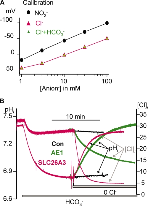 Figure 1. Stoichiometry of Cl−/HCO3− exchange by slc26a3. (A) An example of a calibration of the Cl− electrode and that the resin is not sensitive to 90 mM HCO3− (green triangles) and is more selective for NO3− (black circles) than Cl− (red triangles). In B, control Xenopus oocytes (black traces) and an oocyte expressing AE1 (green traces) or slc26a3 (red traces) were bathed in HCO3−-buffered media, and, after the stabilization of pHi, they were incubated in Cl−-free media. The initial rates of pHi and Cli− changes were used to calculate the fluxes and the Cl−/HCO3− stoichiometry that are listed in Table 1. For simplicity, the changes in pHi and Cli− caused by exposure to CO2/HCO3− are shown only for the oocyte expressing slc26a3. In this and all other experiments, the traces shown are from representative experiments, and the number of experiments and means are given in the text.