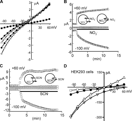 Figure 4. NO3− and SCN− current by slc26a3. Xenopus oocytes expressing slc26a3 and bathed in HEPES-buffered media (A–C) were incubated in media in which Clo− was replaced with NO3− (A and B) or SCN− (C) while measuring the I-V relationship (A) or the current (B and C) at a holding membrane potential of −30 mV and sampling every 10 s by stepping to −100 and 60 mV for 50 ms. In A, the oocyte was incubated in Cl−-containing media (squares) or NO3−-containing media for 1 (circles), 3 (triangles), 5 (diamonds), or 10 min (stars). B and C show the current measured in control (circles) and slc26a3 (squares)-expressing oocytes. The models in B and C show the possible modes of transport at the beginning and end of the incubation period with NO3− and SCN−. (D) The I-V relationship in an HEK293 cell transfected with GFP (squares) or with GFP and slc26a3 and dialyzed with NO3i− and incubated in Na+-free medium in which the major anion was NO3− (squares and triangles), gluconate (inverted triangles), or Cl− (circles). The traces in A–D are from single experiments, and the means and number of experiments are given in the text.