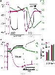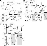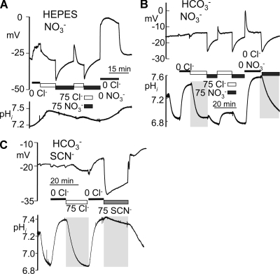 Figure 5. Uncoupled NO3− and SCN− fluxes by slc26a3. Xenopus oocytes expressing slc26a3 were bathed in HEPES-buffered (A) or HCO3−-buffered media (B and C). As indicated by the solid bars, they were exposed to Cl−-free media, and, after the stabilization of pHi, the rates of Cl−/HCO3− and NO3−/HCO3− exchange (B) or Cl−/HCO3− and SCN−/HCO3− exchange (C) were compared, as marked by the gray areas. In each panel, the changes in membrane potential are shown in the top trace, and the changes in pHi are shown in the bottom trace. Note the slow NO3−/HCO3− exchange and the very slow SCN−/HCO3− exchange. The number of experiments and means are given in the text.