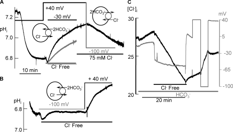 Figure 7. Effect of the membrane potential on HCO3− and Cl− transport by slc26a6. A Xenopus oocyte expressing slc26a6 was bathed in HCO3−-buffered media. (A) After the stabilization of pHi, the membrane potential was clamped at −30 (gray trace) or 40 mV (black trace) before exposing the oocyte to Cl−-free medium. Where indicated, Clo− was restored, and, after an additional 5 min, the membrane potential was switched from 40 to −100 mV (gray period). (B) After stabilization of the pHi of the oocyte incubated in HCO3−-buffered media, the membrane potential was clamped at −100 mV, and the oocyte was exposed to Cl−-free medium (gray period). Where indicated by the black period, the membrane potential was switched to 40 mV. The models depict the mode of exchange measured at each period. (C) After the stabilization of Cli− (black trace), the oocyte was incubated in Cl−-free medium without holding the membrane potential was then incubated in the presence of Clo− while holding the membrane potential at 40 or −100 mV as indicated. Note the initiation of Cl− influx into the oocytes by holding the membrane potential at −100 mV. Each experiment is representative of at least three others with similar results.