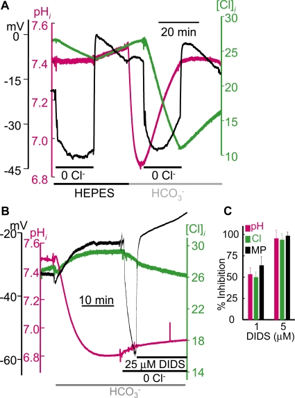 Figure 8. Coupling of Cl− and HCO3− transport by slc26a6. (A) An oocyte expressing slc26a6 was incubated in Cl−-free medium while bathed in HEPES-buffered and HCO3−-buffered media. Red trace, pHi; green trace, Cli−; black trace, membrane potential. This experiment is representative of three others with similar results. (B) An oocyte expressing slc26a6 and bathed in HCO3−-buffered media was incubated in Cl−-free medium, and, shortly after the removal of Clo−, 25 μM DIDS was added to the perfusate, which halted the Cl− (green trace) and HCO3− (red trace) fluxes and reversed the hyperpolarization (black trace). (C) Summary of the changes in pHi (red bars), Cli− (green bars), and membrane potential (MP; black bars) recorded in four experiments in which oocytes expressing slc26a6 bathed in HCO3−-buffered media were incubated with either 1 or 5 μM DIDS before the incubation in Cl−-free media that contained the respective concentrations of DIDS. The effect of preincubation with 25 μM DIDS, which completely inhibited the fluxes and the associated change in membrane potential, was taken as 100% to calculate the percent inhibition by 1 and 5 μM DIDS. Error bars represent SEM.