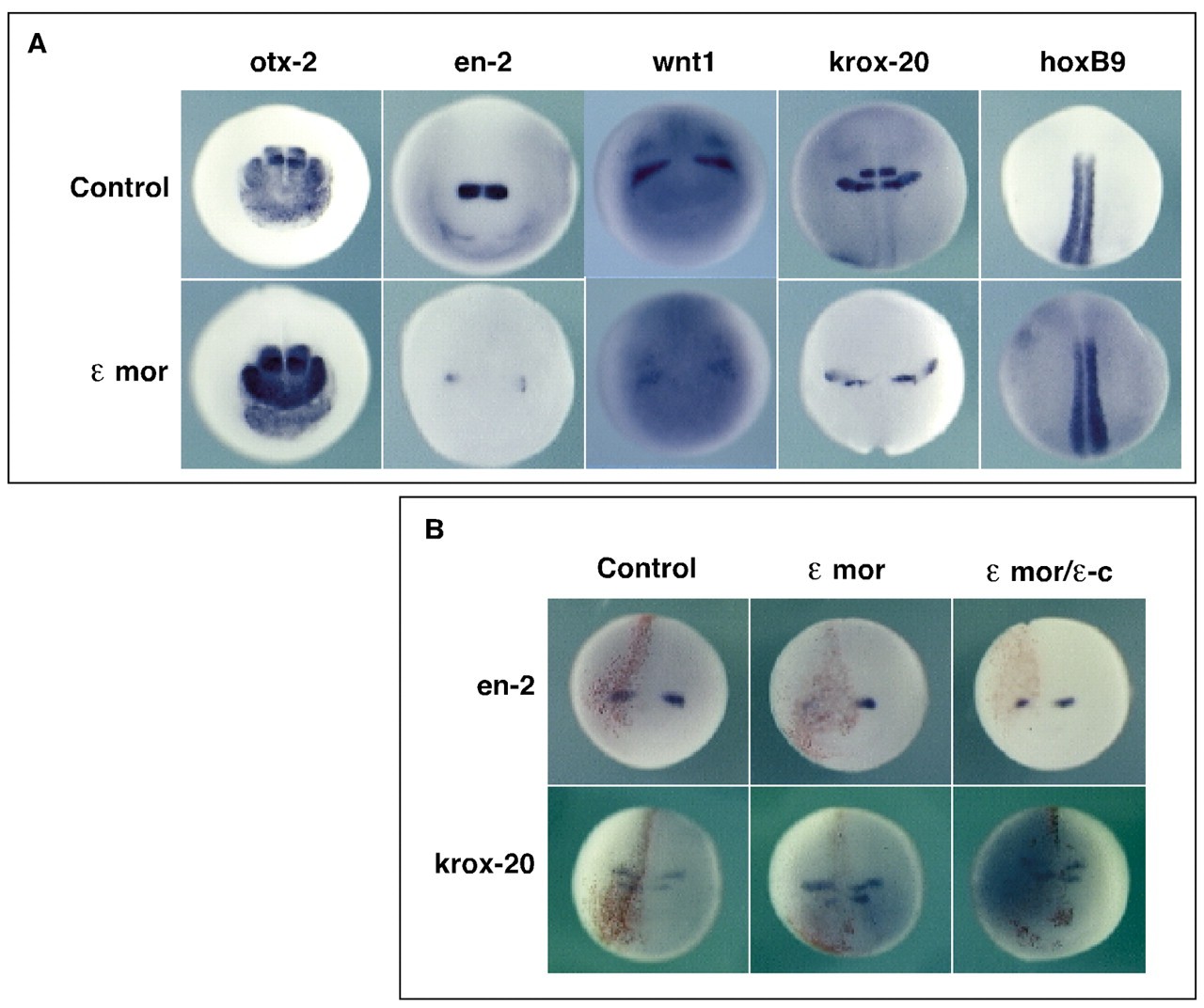 Fig. 4. PP2A:B56ϵ is required for MHB and anteriorhindbrain gene expression in stage 16 neurulae. (A) The expression of otx2, en2, wnt1, krox20 and hoxB9 at the mid-neurula stage (stage 16) in control embryos (upper panels) and embryos injected with 2.5 ng PP2A:B56ϵ morpholino (lower panels) into both dorsal animal blastomeres at the 8-cell stage. For otx2, en2 and wnt1: anterior view; krox20 and hoxB9: dorsal view, with anterior upper most). (B) The expression of en2 and krox20 in embryos injected unilaterally with PP2A:B56ϵ morpholino (middle column), or PP2A:B56ϵ morpholino together with PP2A:B56ϵ-c mRNA (right column). All embryos were co-injected with nuclear β-galactosidase mRNA as a lineage tracer. Control (left column) is n-β-gal alone.