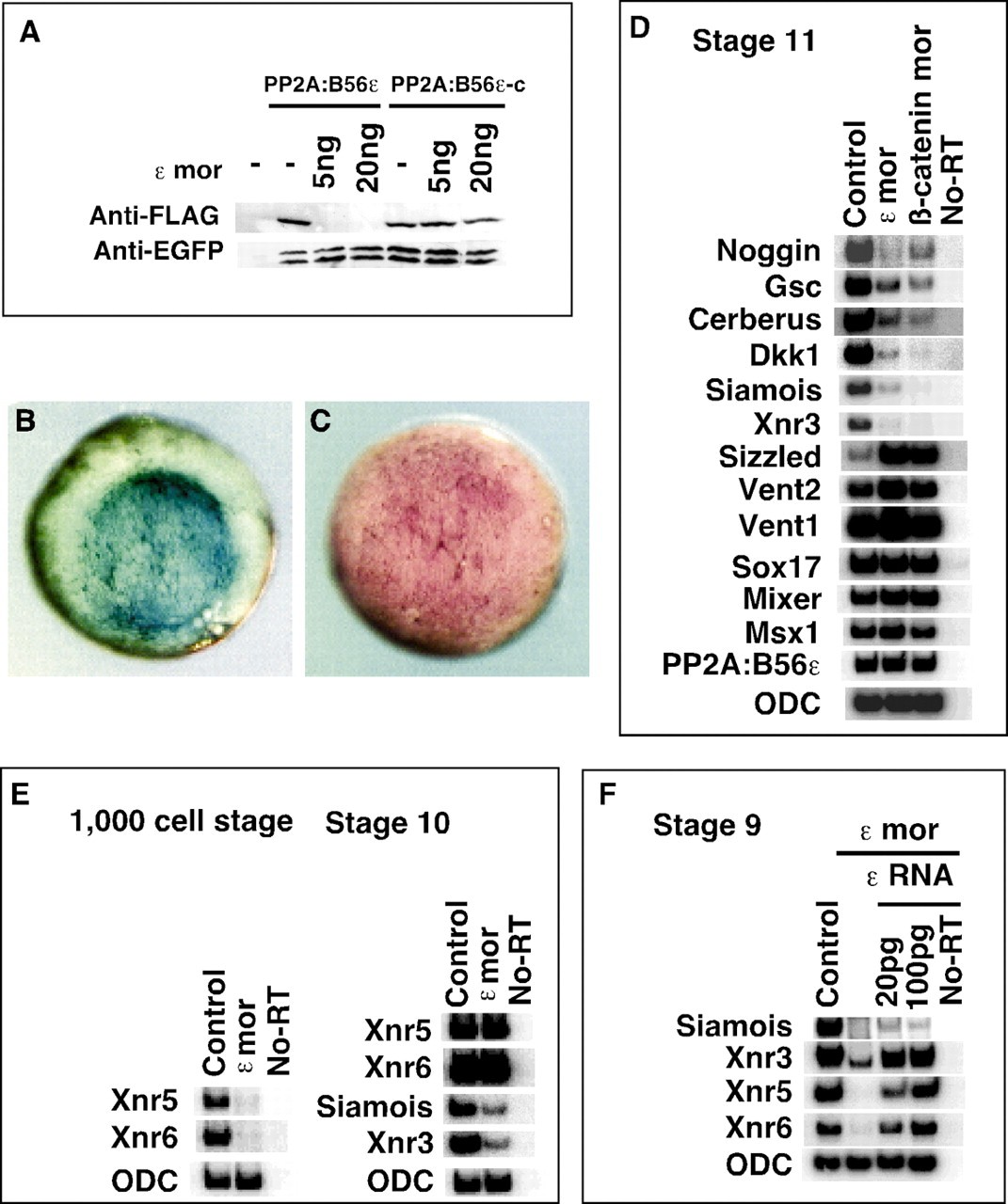 Fig. 2. Maternal PP2A:B56ϵ is required for dorsal development. (A) Morpholino antisense oligonucleotide directed against PP2A:B56ϵ blocks the translation of flag-tagged PP2A:B56ϵ RNA, but not flag-tagged PP2A:B56ϵ-c, in Xenopus oocytes, as determined by western blotting. EGFP mRNA was coinjected and western blotted with anti-GFP as a control. (B) Vegetal view of an uninjected host-transfer embryo at the onset of gastrulation (stage 10+), showing formation of the dorsal lip of the blastopore. (C) Vegetal view of a maternal PP2A:B56ϵ-depleted embryo also at stage 10+, showing absence of dorsal lip. (D) RT-PCR showing the gene expression profile in maternal PP2A:B56ϵ and β-catenin-depleted embryos at midgastrula stage (stage 11). (E) RT-PCR showing reduced expression of Xnr5 and Xnr6 at the 1,000-cell stage and reduced expression of siamois and Xnr3 at gastrula stage (stage 10). (F) RT-PCR showing reduction of dorsal gene expression in maternal PP2A:B56ϵ-depleted embryos could be rescued by PP2A:B56ϵ-c mRNA.