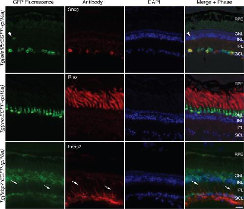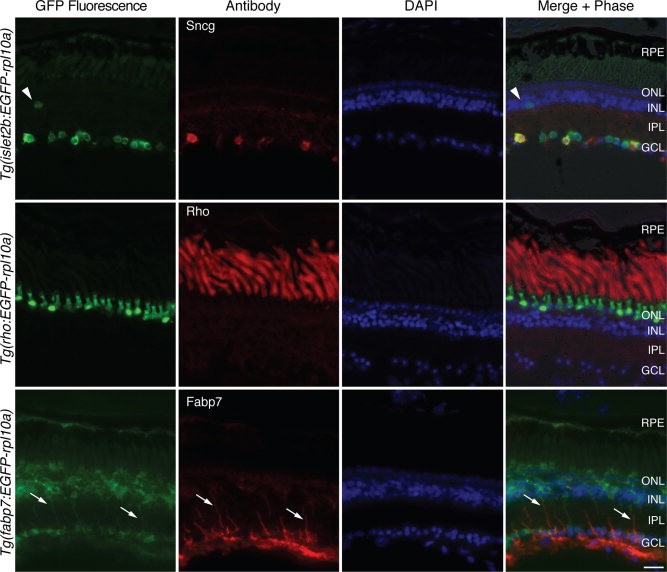 Figure 1. X. laevis lines have specific expression of EGFP-Rpl10a in rods or RGCs. Representative images show GFP fluorescence of the EGFP-rpl10a transgene in retinal sections of stage 57 F1 progeny (green; left column) from lines expressing the EGFP-rpl10a cDNA under the control of zebrafish islet2b (isl2b), X. laevis rhodopsin (rho), or X. tropicalis fatty acid binding protein 7 (fabp7) upstream regulatory sequences. Immunostaining using cell typeâspecific antibodies (red; second column) specific for RGCs (Sncg), rods (Rho), and Müller cells (Fabp7) confirms cell type-specificity of the Tg(rho:EGFP-rpl10a) and Tg(isl2b:EGFP-rpl10a) lines but not Tg(fabp7:EGFP-rpl10a) line. DAPI shows the nuclear cell layers (blue; 3rd column) while a composite image of the GFP fluorescence, antibody, DAPI and brightfield identifies any overlap between endogenous GFP fluorescence and immunostaining (Merge + Phase; 4th column). Arrowheads point to a presumed displaced RGC. Arrows point to Müller cell processes. RPE, retinal pigment epithelium; ONL/INL, outer and inner nuclear layers; IPL, inner plexiform layer; GCL, ganglion cell layer. Scale bar = 20 μm.Download figure to PowerPoint
