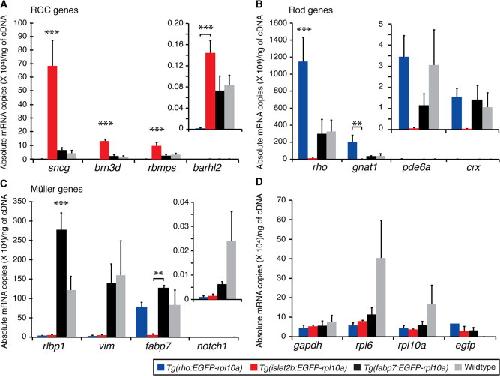 Figure 4. Lines expressing EGFP-rpl10a in rods and RGCs enable efficient enrichment of cell typeâspecific mRNAs. Graphs show absolute expression levels of mRNA for affinity-purified TRAPed mRNAs from transgenic lines (blue, Tg(rho:EGFP-Rpl10a); red, Tg(isl2b:EGFP-Rpl10a); black, Tg(fabp7:EGFP-Rpl10a)) and from the unbound fraction of wildtype control eyes (grey, Wildtype). To determine the gene expression copy number, a standard curve was generated for each of the genes tested by qPCR (Supp. Fig. S2). Due to large differences in absolute gene expression values, genes expressed at low levels require a different y-axis scale (see inset bar graphs for barhl2 [A], pde6a and crx [B], and notch1 [C]). Asterisks reflect the level of significance for individual pair-wise comparisons between the marked genotype and either one other genotype (bracket) or all other genotypes (Tukey test; **P < 0.005; ***P < 0.001).Download figure to PowerPoint