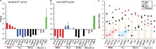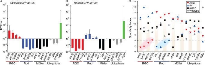 Figure 5. The IP/Total ratio and Specificity Index (SI) provide independent measures to identify genes enriched above background levels in different cell types. A,B: Data for each of three biological replicates are plotted as the ratio of the absolute expression level for the IP for Tg(isl2b:EGFP-Rpl10a) (A) and Tg(rho:EGFP-Rpl10a) (B) TRAPed mRNAs over the absolute expression level for RNAs purified from total unbound fraction from a reference wildtype sample (Total) for each gene. Standard error of the mean (error bars) was calculated based on the standard deviation for a ratio as described in the Experimental Procedures section. C: Scatter plot of the SI for all cell types plotted against individual genes shows a clustering of cell typeâspecific enrichment for RGCs (red highlighted cluster) and rod phototoreceptor cells (blue highlighted cluster). Genotypes on graph are as indicated isl2b = Tg(isl2b:EGFP-rpl10a); rho = Tg(rho:EGFP-rpl10a); fabp7 = Tg(fabp7:EGFP-rpl10a). P values are significant at an SI less than 4 (dashed line, P < 0.1).Download figure to PowerPoint