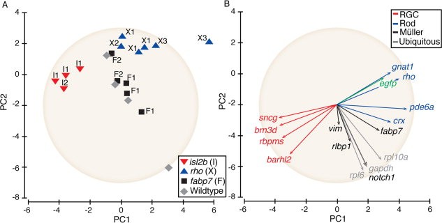 Figure 6. TRAP provides cell-type enrichment for genes of different absolute expression levels and reproducibility across different transgenic lines in the X. laevis retina. A: PCA of individual samples showing qPCR-based expression levels from TRAPed replicates from the same GFP-rpl10a frog lines as well as from different lines. B: PCA of the contribution of each of the 16 analyzed genes on the overall variance. The placement and length of the vectors show the contribution to the variance for each gene. The gene expression data have been standardized to a value of 1, demarked by the tan circle (see Experimental Procedures section).Download figure to PowerPoint