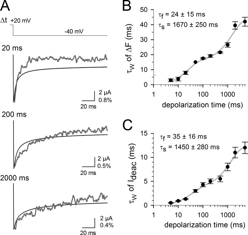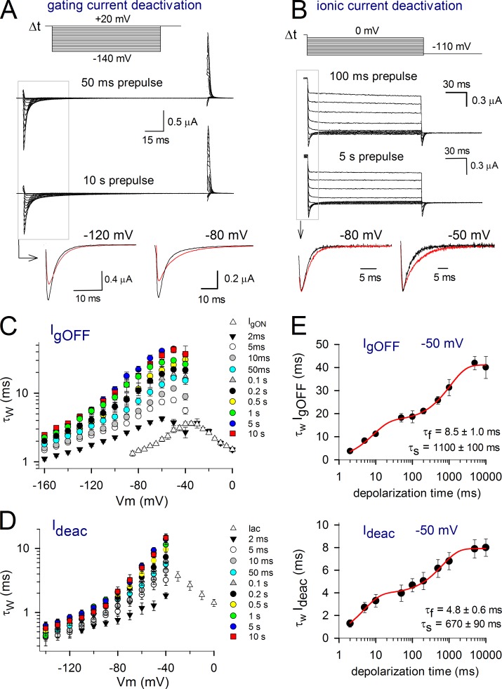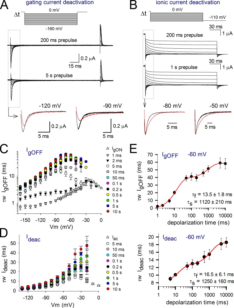 Voltage-dependent potassium (Kv) channels provide the repolarizing power that shapes the action potential duration and helps control the firing frequency of neurons. The K(+) permeation through the channel pore is controlled by an intracellularly located bundle-crossing (BC) gate that communicates with the voltage-sensing domains (VSDs). During prolonged membrane depolarizations, most Kv channels display C-type inactivation that halts K(+) conduction through constriction of the K(+) selectivity filter. Besides triggering C-type inactivation, we show that in Shaker and Kv1.2 channels (expressed in Xenopus laevis oocytes), prolonged membrane depolarizations also slow down the kinetics of VSD deactivation and BC gate closure during the subsequent membrane repolarization. Measurements of deactivating gating currents (reporting VSD movement) and ionic currents (BC gate status) showed that the kinetics of both slowed down in two distinct phases with increasing duration of the depolarizing prepulse. The biphasic slowing in VSD deactivation and BC gate closure was strongly correlated in time and magnitude. Simultaneous recordings of ionic currents and fluorescence from a probe tracking VSD movement in Shaker directly demonstrated that both processes were synchronized. Whereas the first slowing originates from a stabilization imposed by BC gate opening, the subsequent slowing reflects the rearrangement of the VSD toward its relaxed state (relaxation). The VSD relaxation was observed in the Ciona intestinalis voltage-sensitive phosphatase and in its isolated VSD. Collectively, our results show that the VSD relaxation is not kinetically related to C-type inactivation and is an intrinsic property of the VSD. We propose VSD relaxation as a general mechanism for depolarization-induced slowing of BC gate closure that may enable Kv1.2 channels to modulate the firing frequency of neurons based on the depolarization history.