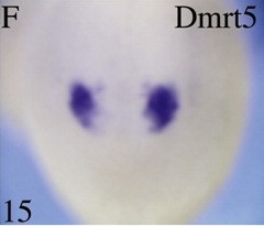dmrta2 (DMRT-like family A2) gene expression in Xenopus laevis embryo, assayed via in situ hybridization, NF stage 17, anterior view, dorsal up.