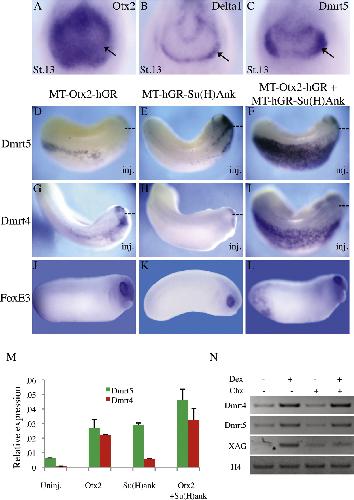 Fig. 4. Combined overexpression of Otx2 and Su(H)Ank efficiently induces ectopic Dmrt5 and Dmrt4 expression in the ectoderm. (A)C) Anterior views of neurula stage embryos hybridized with Otx2, Delta1 or Dmrt5. Arrows indicate the region of the olfactory placodes. (D)-L) Otx2-Notch combined activation in the ectoderm efficiently induces Dmrt5 and Dmrt4 expression in the ectoderm. Embryos injected with MT-Otx2-hGR and MT-hGR-Su(H)Ank (500 pg each) were induced with Dex at stage 123, and then subjected to LacZ staining and in situ hybridization with the indicated probes. (D)I) Dorsal views with anterior to the right. (J)L) Lateral views of the injected side. Moderate ectopic Dmrt4 and Dmrt5 expression was detected in embryos injected with Otx2 mRNA alone throughout the ectoderm. While moderate ectopic Dmrt5 expression mainly restricted to the head ectoderm was also detected in Su(H)Ank mRNA injected embryos, no ectopic Dmrt4 was observed in Su(H)Ank mRNA injected embryos. Embryos coexpressing Otx2 and Su(H)Ank show robust ectopic Dmrt4 and Dmrt5 staining throughout the ectoderm. FoxE3 used as control was as previously reported not induced in embryos injected with Otx2 alone or with Su(H)Ank alone injected embryos but was ectopically activated in embryos injected with both constructs. (M) Real time RT-PCR analysis of Dmrt5 and Dmrt4 expression in animal caps derived from four-cell stage embryos injected with MT-Otx2-hGR or MT-hGR-Su(H)Ank mRNA, alone or in combination (500 pg per blastomere). Note that their combination induces stronger expression of Dmrt5 and Dmrt4 than that induced by Otx2 or Su(H)Ank alone. Each value has been normalized to the level of GAPDH expression. (N) Real time RT-PCR analysis of the expression of Dmrt5, Dmrt4 and XAG in animal caps derived from embryos injected with MT-Otx2-hGR and MT-hGR-Su(H)Ank mRNA, treated or not with dexamethasone (Dex) and cycloheximide (CHX). Note that both Dmrt5 and Dmrt4, but not XAG, are activated by MT-Otx2-hGR and MT-hGR-Su(H)Ank in the presence of CHX. |