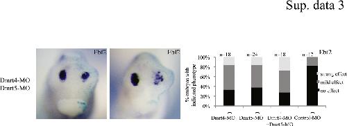 Fig. S3. Effect of the double knock down of Dmrt4 and Dmrt5 on Ebf2 expresion. (A) Frontal view of tadpole embryos injected unilaterally with the indicated morpholinos (10 ng for Dmrt4-MO and Dmrt5-MO, 20 ng for MOc) and hybridized with Ebf2. LacZ mRNA was coinjected as a tracer. Changes in the expression of Ebf2 were scored in individual embryos by comparing the injected and uninjected sides of embryos. Embryos were classified into three phenotypes: no changes, weak reduction and strong reduction or absence of expression. Left and right panels show examples of embryos showing weak and strong reduction of Ebf2, respectively. (B) RT-qPCR analysis of Ebf2 expression in animal caps (stage 14) derived from embryos injected with Noggin (100 pg), MOc (10 ng), Dmrt4-MO (10 ng) and Dmrt5-MO (10 ng), as indicated. Expression levels were normalized to GAPDH and compared to the level observed in Noggin injected caps, which was set to 1. Note that in neuralized animal caps and in embryos, the severity of the phenotype observed in double knockdown is weakly increased compared to the phenotype observed in single knockdown. |