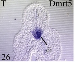 dmrta2 (DMRT-like family A2) gene expression in Xenopus laevis embryo, assayed via in situ hybridization, NF stage 26, transverse section at forebrain level of head, dorsal up.