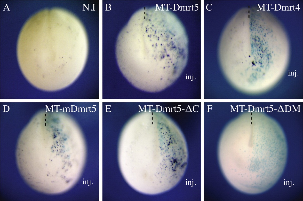 Fig. 6. Increased apoptosis in Dmrt5 overepressing embryos. (A)F) Embryos (stage 15) injected with the indicated Myc-tagged constructs (50 pg) analysed by TUNEL staining. Dorsal views are shown with anterior to the bottom. An increase of staining was detected on the injected side in 93% of embryos, n=45 for MT-Dmrt5; 51%, n=74 for MT-Dmrt4; 85%, n=39 for MT-mDmrt5; 56%, n=43 for MT-Dmrt5δC and 12%, n=113 for MT-Dmrt5δDM. |