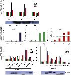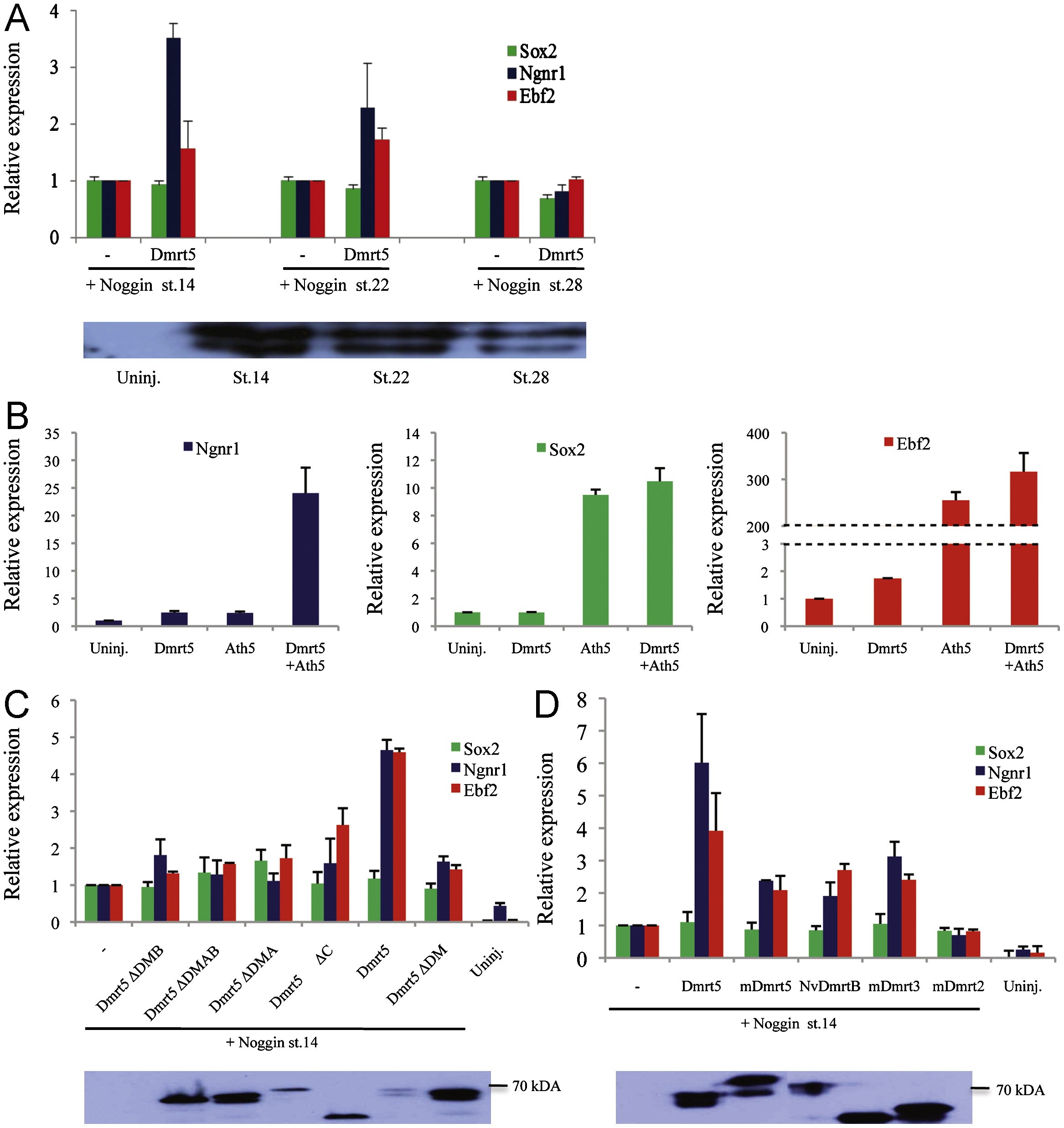 Fig. 7. Regulation of Sox2, Ngnr1 and Ebf2 by Dmrt5. (A) Animal caps were isolated from embryos injected with Noggin (100 pg), Xenopus MT-Dmrt5 (50 pg) as indicated, cultured until sibling embryos reached stages 14, 22 or 28 and subjected to RT-qPCR analysis. Note that injection of Xenopus Dmrt5 upregulates Ngnr1 and Ebf2 and has no effect on Sox2 in neuralized caps at stages 14 and 22, but not 28. A control western blot shows the decreasing levels of overexpressed MT-Dmrt5 in the caps at the different times analysed. (B) Animal caps from embryos injected with MT-Dmrt5 (50 pg) and Ath5 (250 pg) as indicated and analysed at stage 14 by RT-qPCR for Ngnr1, Ebf2 and Sox2. Note that Dmrt5 slightly induces Ngnr1 and Ebf2 in nae caps and that it promotes their expression in MT-Ath5 overexpressing caps while Sox2 is unaffected. (C) and (D) Animal caps from embryos injected with Noggin mRNA (100 pg) alone or coinjected with mRNA encoding the indicated myc-tagged constructs (50 pg each) harvested at stage 14 and analysed by RT-qPCR for Ngnr1, Ebf2 and Sox2. Note that both the DM and the conserved DMA and DMB domains are required for Dmrt5's ability to induce Ngnr1 and Ebf2 and that mDmrt3, NvDmrtb but not mDmrt2 induces Ngnr1 and Ebf2 expression. In all cases, expression levels were normalized to GAPDH. In (A), (C) and (D), expression levels were compared to the level observed in Noggin injected caps, which was set to 1. Control western blots showing the overproduced proteins are shown. |