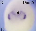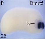 Fig. 2. Dmrt5 temporal and spatial expression pattern. (A) Temporal expression of Dmrt5 by RT-PCR. RNA was extracted from embryos at the indicated stages. Histone H4 was used as a loading control. (B)Z) Spatial expression pattern of Dmrt5 compared to that of Dmrt4 analysed by whole-mount in situ hybridization. Unless indicated, all embryos are shown in anterior views. Nieuwkoopaber stages are indicated. (B) Initial expression of Dmrt5 is observed at stage12.5 in a horse-shoe shaped area in the anterior region of the neurectoderm. (C) Embryo at the stage as in (A) double stained with NBT-BCIP for Dmrt5 and Nkx2.1 showing that Dmrt5 and Nkx2.1 do not overlap. (D)G) At stage 135, both Dmrt5 and Dmrt4 genes are detected bilateraly at the anterior neural plate border, the Dmrt5 staining region being broader and extending less medially than the Dmrt4 stained area. Weak Dmrt5 expression is also detected at stage 13 in a stripe bordering the posterior side of the initial horse-shoe shaped stained zone (arrowhead). (H) Stage 15 embryo double stained with Dlx6 (dark blue) and Dmrt5 (light blue) showing that Dmrt5 is expressed in a subdomain of the preplacodal ectoderm and that its expression extends to the adjacent neural plate (arrowhead). (I)L) Single (I) and (J) and double (K) and (L) in situ hybridization showing that at stage 17, Dmrt5, but not Dmrt4, is coexpressed with BF-1 in the developping dorsal telencephalon. Note also that Dmrt5 staining is detected anterior to the domain of expression of the neural crest Slug marker. Arrowheads indicate posterior and anterior boundaries of Dmrt5 and Slug, respectively. (M) and (Z) Relationship between the Dmrt5 and Dmrt4 genes at stages 228, as revealed by single (M)Q), (W)Z) and double in situ hybridization (O). (P), (Q), (X) and (Z) lateral and (W) dorsal views, anterior to the right. A high magnification view of the anterior head fold of a Dmrt5 and Dmrt4 double stained embryo is shown in panel O, with Dmrt5 in light blue and Dmrt4 in dark blue. (R)T) Transverse sections of an embryo through the olfactory epithelium and dorsal telencephalon (R), the anterior (S) or posterior (T) diencephalon. (U) and (V) Horizontal sections though the dorsal telencephalon and diencephalon (U) or through the olfactory placodes and dorsal telencephalon (V). (Y) Sagittal section. Note Dmrt5 strong expression in the dorsal telencephalon, olfactory placodes and diencephalon and weak expression in the prospective lens ectoderm and in the mesenchyme surrounding the eyes. Abbreviations: dt, dorsal telencephalon; hm, head mesenchyme; le, lens ectoderm; di, diencephalon; op, olfactory placodes; ppe, preplacodal ectoderm. |