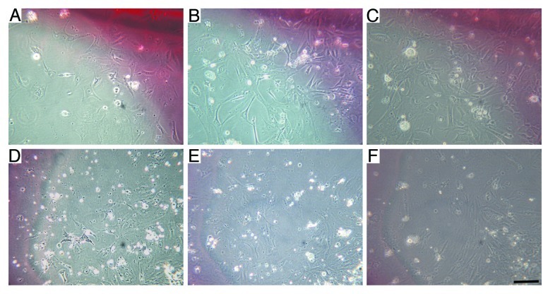 Figure 1. Defective in vitro expansion of cybrids cells. The concentration of control haploid [l]xl embryonic cells (A-C) in a given area of a culture dish visibly increased over time, while that of [l]xt cybrid cells (D-F) did not. Pictures in (B, E) and (C, F) were taken 5 and 13 d, respectively, after those in (A, D). Scale bar: 0.1 mm.