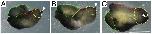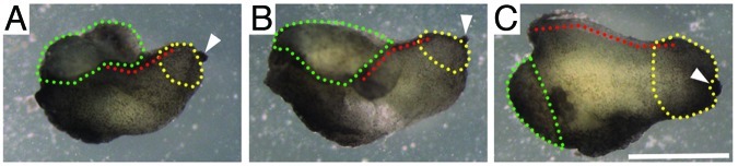 Figure 2. Improved cybrid embryo development by nuclear species maternal poly(A)+ RNA injection. The most developed [l]xt cybrid embryo that was obtained following injection at the 1-cell stage with (A) dH20, (B) X. laevis oocyte poly(A)+ RNA, or (C) X. tropicalis oocyte poly(A)+ RNA from one experiment are shown as an example. All three embryos had a rudimentary sucker (arrowhead), yet noticeable improvements in the development of the animal shown in (C) include a better blastopore closure (green dotted line), axis formation and elongation (red dotted line), muscular response, and an increased head size (yellow dotted line). Embryos are shown (anterior to the right; dorsal up) at 48 h post-fertilization, about 24 h before they were finally scored for inclusion in Table 2. Scale bar: 1 mm.
