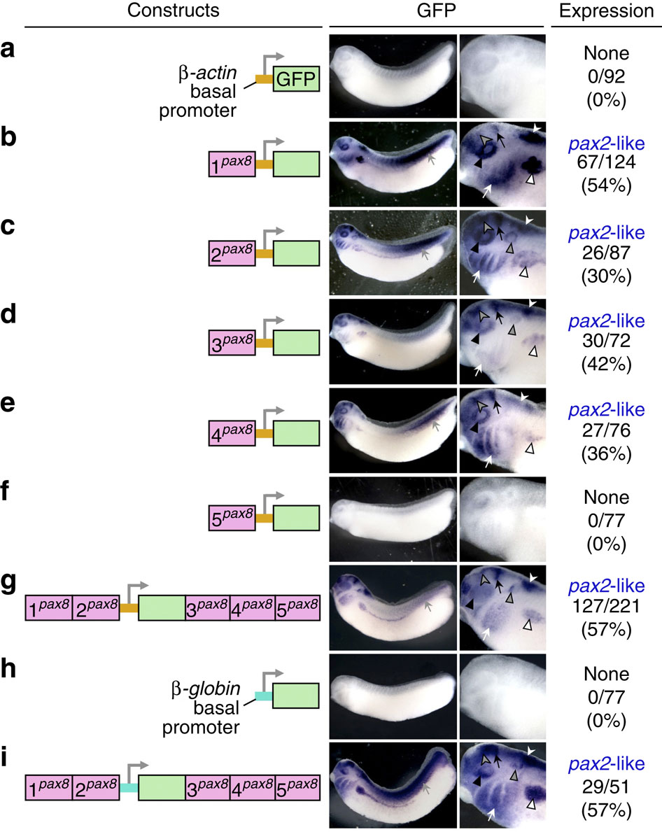 Figure 2: GFP expression driven by pax8-CNSs recapitulates the pleiotropic expression of pax2. Transgenic X. laevis embryos were generated with the following reporter constructs and their expression was analysed using in situ hybridization. (a) The β-actin basal promoter alone was linked to GFP. (bâf) The β-actin promoter-GFP cassette was flanked by either X. tropicalis pax8-CNS1 (b), pax8-CNS2 (c), pax8-CNS3 (d), pax8-CNS4 (e) or pax8-CNS5 (f). (g) The β-actin promoter-GFP cassette was flanked by all the pax8-CNSs. (h) The β-globin basal promoter alone was linked to GFP. (i) The β-globin promoter-GFP cassette was flanked by all the pax8-CNSs. The X. tropicalis pax8-CNS1 to pax8-CNS5 are shown as 1pax8 to 5pax8. Representative examples of GFP expression are shown together with the injected reporter constructs. The right-hand panels show high-magnification views of the embryonic head regions illustrated in the left-hand panels. GFP expression patterns are summarized on the extreme right with the scoring results. Numbers of embryos with the positive expression similar to the representative examples, and the total number of analysed embryos injected with each construct are indicated with percentages of the former cases. White, grey and black triangles indicate expression in the pronephros, otic vesicle and eye, respectively. White, grey and black arrows indicate expression in the pharyngeal arches, somites and MHB, respectively. White and grey arrowheads indicate expression in the hindbrain and anteriormidbrain, respectively.