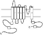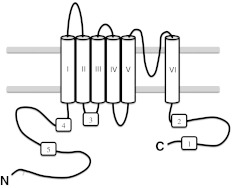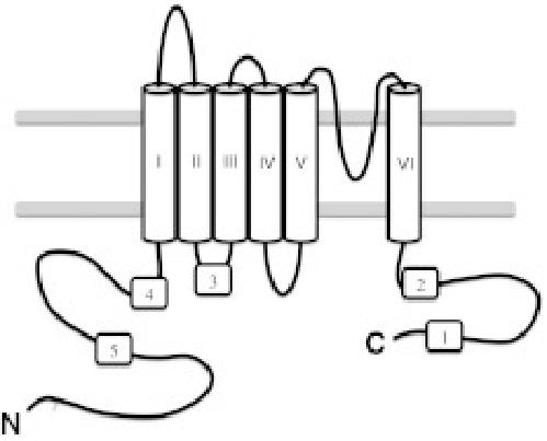 Fig. 1. Topology diagram of a typical TRP channel consisting of six transmembrane domains and intracellular N- and C-termini. Predicted CaM binding sites are numbered started from C-terminal side. V5p1 and V6p1 peptides correspond to the CaM binding site 1 of TRPV5 and TRPV6, respectively, as V5p2, V5p3/V6p3, V5p4 and V5p5 correspond to the CaM binding site 2, 3, 4 and 5 of TRPV5/6 (see also Table 1)