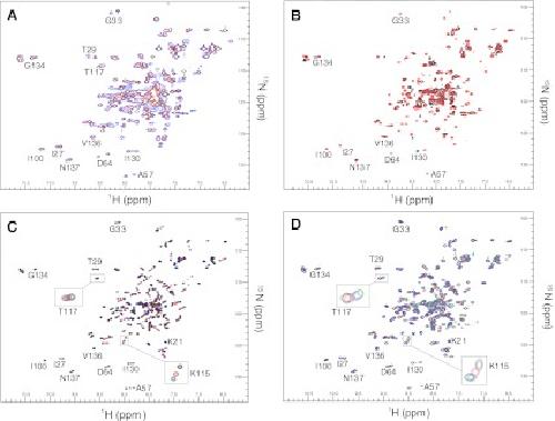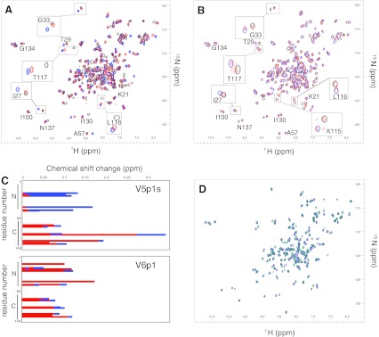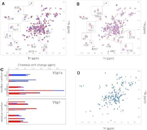 Fig. 2. Overlaid 15N-1H-HSQC CaM-peptide NMR spectra and data analysis. Five to ten contours were deliberately spaced closely to allow for proper overlaying of the spectra and emphasis of the changes. a CaM-V5p1s spectra at CaM:V5p1s 1:0 (black), 1:1 (red) and 1:2 (blue) molar ratio. b CaM-V6p1 spectra at CaM:V6p1 1:0 (black), 1:1 (red) and 1:2 (blue) molar ratio. c Chemical shifts induced by the peptide as a function of CaM residue number at CaM-peptide 1:1 (red) and 1:2 (blue) molar ratio. d CaM-V5p1s (dark blue) and CaM-V6p1 (teal) spectra at 1:2 CaM:peptide molar ratio