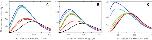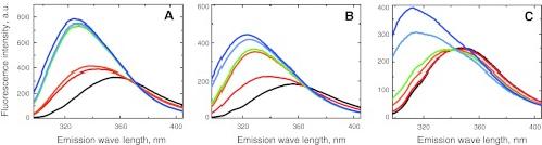 Fig. 4. Tryptophan fluorescence spectra of the peptides V5p1s (a), V6p1 (b) and V5p2 (c) in response to titration by CaM. Peptide:CaM ratios 1:0 (black), 1:0.5 (red), 1:0.75 (orange), 1:1 (green), 1:1.5 (light-blue) and 1:2 (dark blue)
