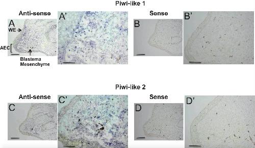 Fig. 2. In situ hybridization of axolotl PL1 and PL2 in regenerating axolotl forelimb blastemas at an early-to-medium stage. For both PL1 and PL2 anti-sense probes, the positive signal (blue) was spread through the entire region of blastemamesenchyme and was also present in the basal layer of the wound epidermis (WE) and the thickened apical epithelial cap (APC). Images Aâ², Bâ², Câ² and Dâ² are higher magnification views of the corresponding images in A, B, C and D, respectively. Scale bar in images AâD is 500 μm, and for images Aâ²âDâ², 200 μm.